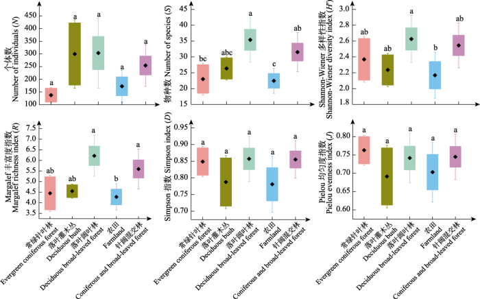 秦岭西段地区不同生境间蝴蝶的物种数、Shannon-Wiener多样性指数和Margalef丰富度指数存在显著差异, 个体数、Simpson指数和Pielou均匀度指数间无显著差异。个体数排序为落叶阔叶林 >落叶灌木丛 > 针阔混交林 > 农田 > 常绿针叶林,物种数排序为落叶阔叶林 > 针阔混交林 > 落叶灌木丛 > 常绿针叶林 > 农田, Shannon-Wiener指数和Simpson指数排序为落叶阔叶林 > 针阔混交林 > 常绿针叶林 > 落叶灌木丛 > 农田, Margalef丰富度指数排序为落叶阔叶林 > 针阔混交林 > 落叶灌木丛 > 常绿针叶林 > 农田, Pielou均匀度指数排序为常绿针叶林 > 落叶阔叶林 > 针阔混交林 > 农田 > 落叶灌木丛(图2)。