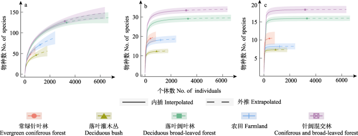 基于实际观测到的蝴蝶数量进行稀疏外推分析, 结果显示, 针阔混交林中的Shannon-Wiener多样性和Simpson多样性最高, 落叶阔叶林略小, 常绿针叶林居中, 农田生境小于常绿针叶林, 落叶灌木丛最小; 物种丰富度为针阔混交林最高, 落叶阔叶林略小, 农田居中, 常绿针叶林小于农田生境, 落叶灌木丛最小(图3)。