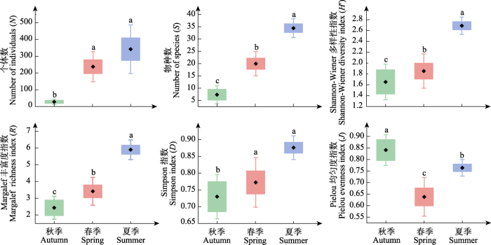 不同季节间蝴蝶群落多样性指数差异较大, 除Pielou均匀度指数外, 其余各多样性指数排序为夏季 > 春季 > 秋季, 夏季、春季的蝴蝶群落个体数和Simpson指数同秋季间存在显著差异, 春、夏、秋季的蝴蝶群落物种数、Margalef丰富度指数和Shannon-Wiener多样性指数均存在显著差异; Pielou均匀度指数排序为秋季 > 夏季 > 春季, 且3个季节间均存在显著差异(图4)。