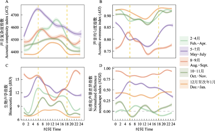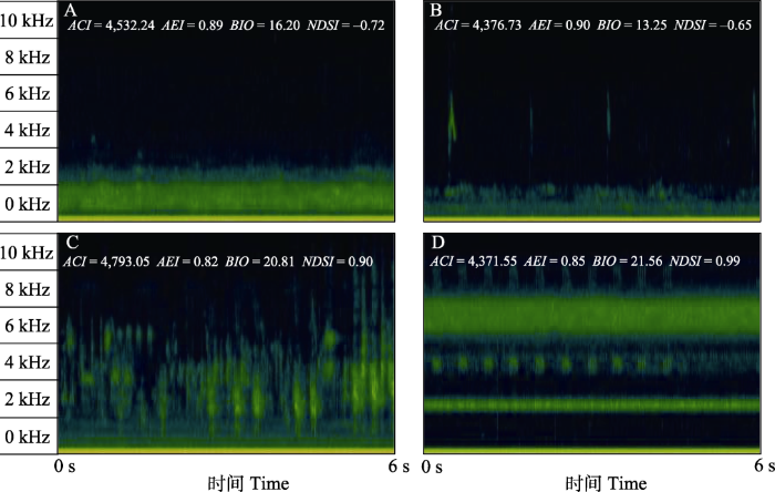 受生物生命周期、活动节律和环境的影响, 生物发声活动表现出特定的时间特征(Saunders, 1947; Krebs & Kacelnik, 1983)。因此, 声景也具有典型的时间格局, 已经在热带雨林、温带森林和海洋等生态系统中发现声景表现出日、月或旱雨季等周期性的变化特征。例如, 在非洲热带雨林景观中, 雨季昆虫(主要是蝉科)和灵长类动物活动增加使得雨季的声音饱和度高于旱季(Zwerts et al, 2022)。在温带地区, 鸟类晨昏和鸣使得声音多样性指数(acoustic diversity index, ADI)具有明显的双峰模式(Villanueva- Rivera et al, 2011)。海洋生态系统中, 座头鲸(Megaptera novaeangliae)主要在夜晚发声, 使得夜晚的声压级明显比白天高(Au et al, 2000)。