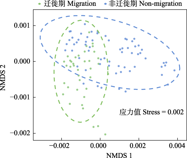 迁徙期和非迁徙期声学指数的非度量多维尺度法(NMDS)排序图