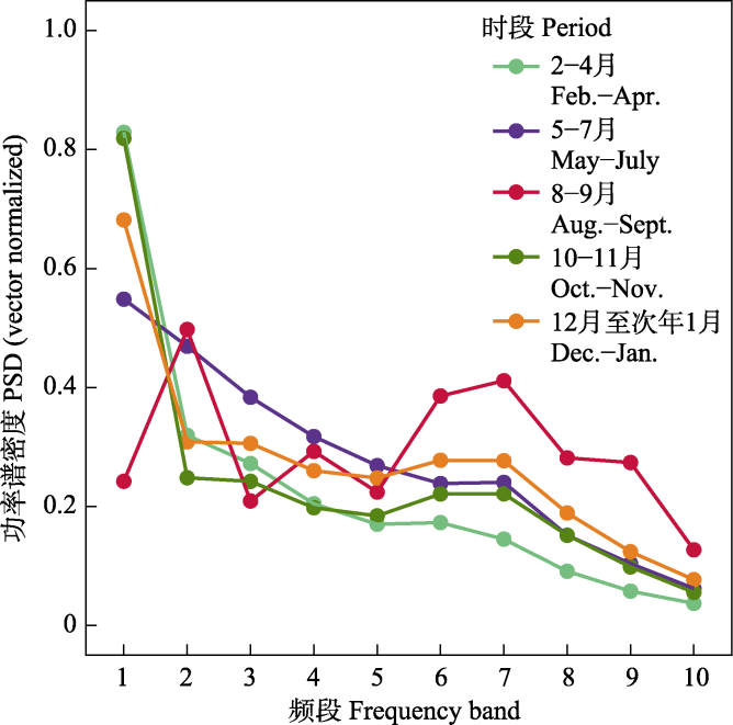 五个时段的功率谱密度(PSD)归一化值。PSDi表示频段i的功率谱密度, 即i到(i + 1) kHz频段的功率谱密度。