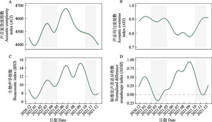 利用vegan程序包对迁徙期和非迁徙期的4种声学指数进行非度量多维尺度法(non-metric multidimensional scaling, NMDS)排序, 评价鸟类迁徙活动是否对湿地声景产生了影响, 并利用相似性分析(analysis of similarities, ANOSIM)检验迁徙期和非迁徙期之间声景差异的显著性。为量化5个时段的声景差异性, 对每个采样点各声学指数每月均值进行Kruskal-Wallis检验。通过ggplot2程序包绘制5个时段以及每个时段昼夜的1-10 kHz PSD变化曲线, 分析各时段或昼夜的主要发声频段。为量化声景的昼夜差异, 在5个时段内对每个采样点各声学指数每月的昼夜均值进行Mann-Whitney U检验。通过广义加性模型(generalized additive model, GAM)拟合声学指数值获得月变化和日变化曲线。因电量不足, 有10台自动录音机在2021年2月停止工作, 所以湿地声景的月变化特征分析中2月声学指数的动态变化通过GAM拟合得出, 2-4月声景的日变化特征分析仅为3月和4月的声学数据。所有统计分析在R4.1.3软件中完成, 显著性检验水平为P = 0.05。
