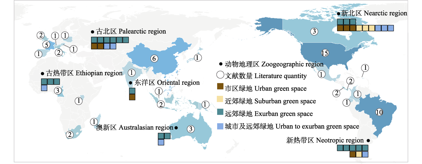 | 图1 动物声景个例研究的全球分布图。 颜色(蓝色)越深表示发表文献数量越多; 圆点、圆圈及正方形图框分别表示6个动物区系、文献数量和各区内4种城市绿地类型的研究数量。 |