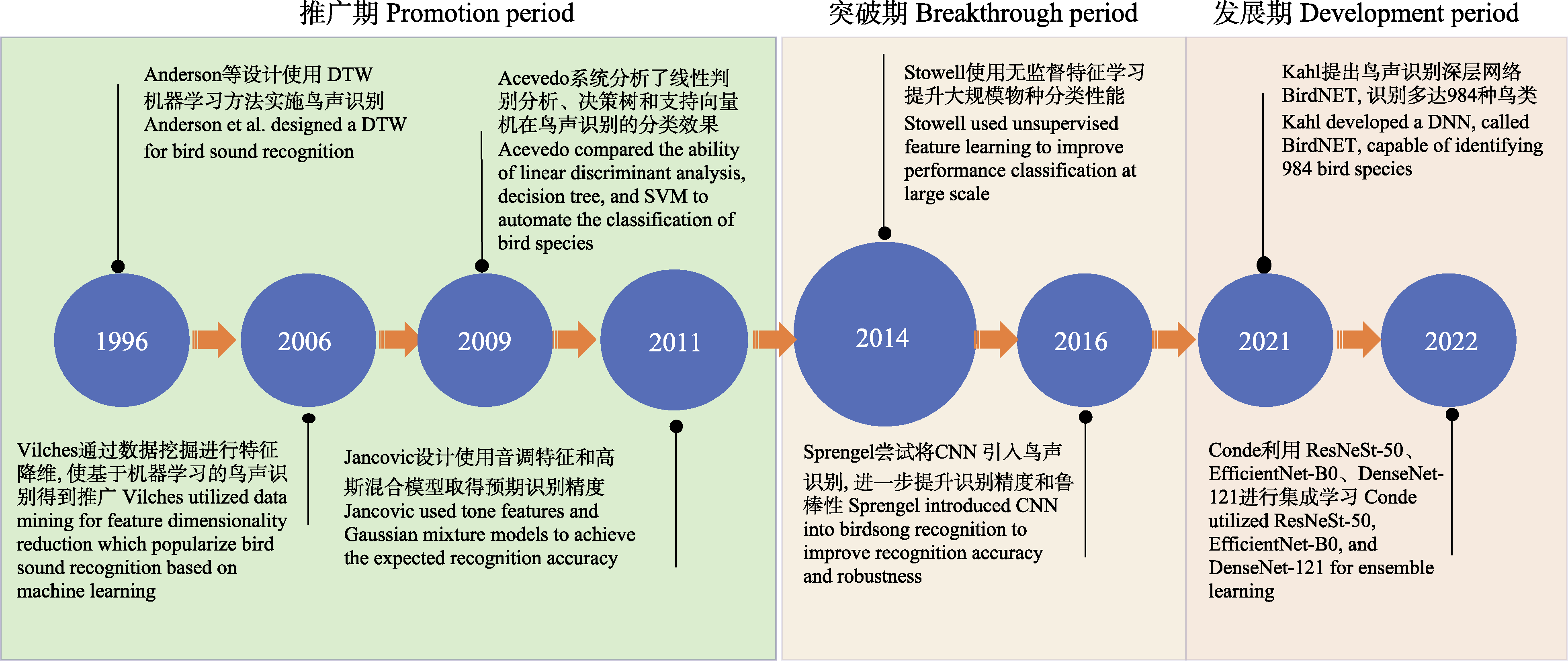 | 图1 鸟声识别算法发展历程。DTW: 动态时间规整; SVM: 支持向量机; CNN: 卷积神经网络; DNN: 深度神经网络。 |