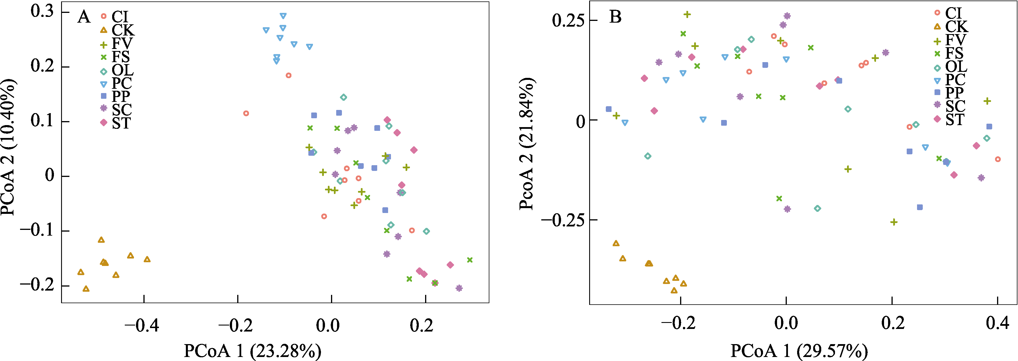 图2 PcoA分析细菌(A)和线虫(B)群落对单独添加不同植物凋落物的响应。CK: 对照处理; PC: 望天树; ST: 绒毛猴欢喜; SC: 华马钱; OL:蚁花; PP: 番龙眼; FV: 黄葛树; FS: 羊乳榕; CI: 印度锥。 |