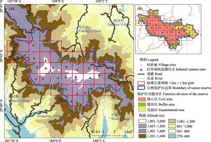 Distribution of infrared camera traps in Laojun Mountain National Nature Reserve. A, Altitude of Laojun Mountain National Nature Reserve and surrounding areas; B, Function division of Laojun Mountain National Nature Reserve.