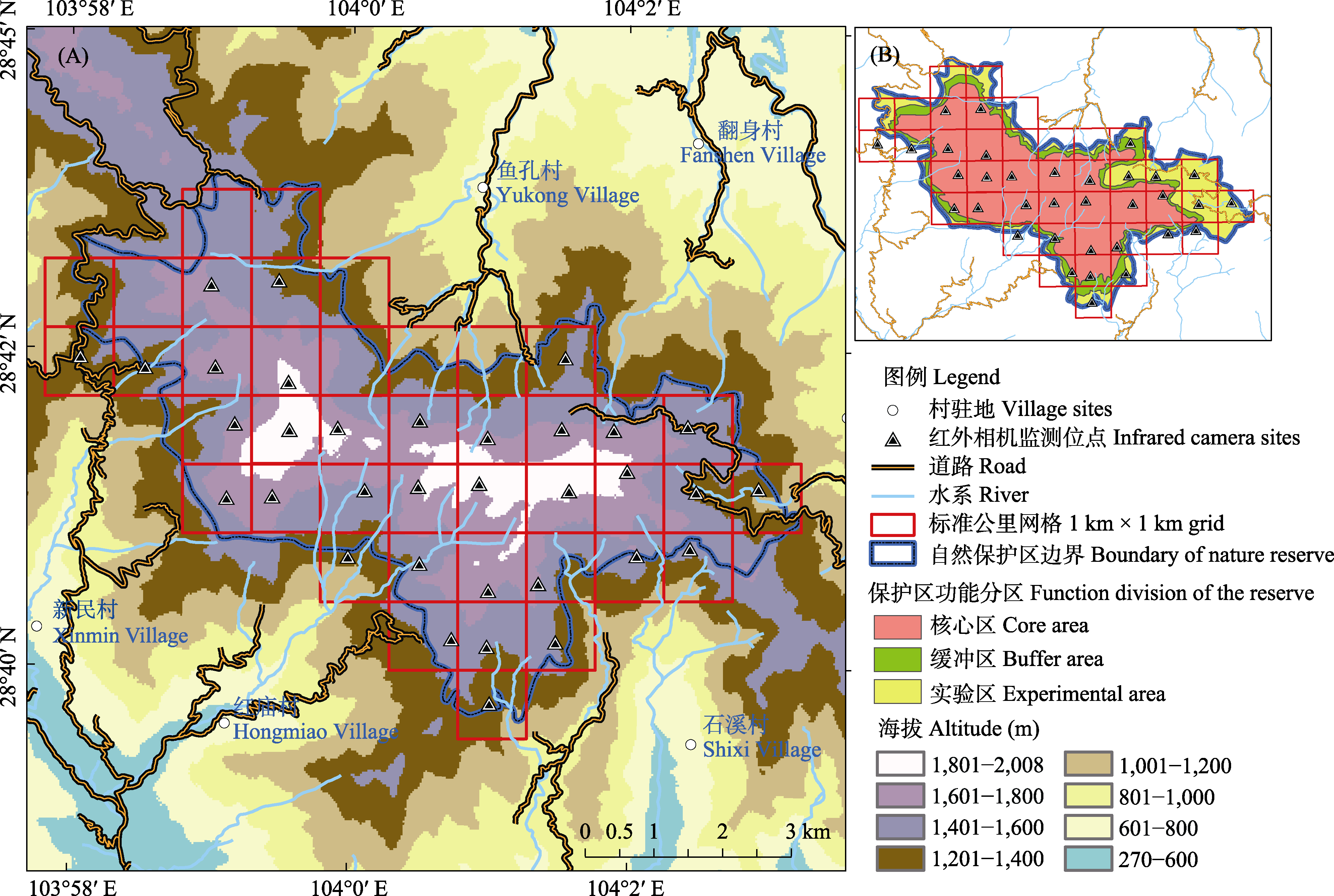 | Fig. 1 Distribution of infrared camera traps in Laojun Mountain National Nature Reserve. A, Altitude of Laojun Mountain National Nature Reserve and surrounding areas; B, Function division of Laojun Mountain National Nature Reserve. |