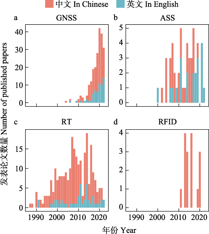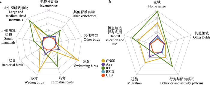 ... 家域(home range)是动物在寻找食物、交配和照顾幼崽的正常活动中所穿越的区域(Burt, 1943), 理解家域对于揭示动物行为, 以及进行有效的野生动物管理和制定保护策略具有至关重要的科学和实践意义.在本研究中, 家域的研究内容包括活动范围和区域(端肖楠等, 2016)、活动模式(张飞宇等, 2020b)、日活动范围(蔡路昀等, 2007)、扩散(楚彬等, 2020)、迁移(刘嘉辉等, 2020)等.在检索获得的276篇相关文献中, 有157篇文献运用了RT术来研究家域(图5), 主要关注小型动物和鸟类的扩散、动物的巢址范围与活动范围、繁殖季家域变化等研究问题.最新的研究探讨了黄河滩中华鳖(Pelodiscus sinensis)的家域(Kong et al, 2021).92篇文献采用了GNSS追踪技术, 关注动物的季节性家域、重引入/野放个体的扩散与家域变化等.近五年来使用GNSS技术的文献数量明显增加.此外, 还有部分研究采用了ASS追踪技术和RFID标记技术, 其中RFID标记技术因其研究半径范围的限制, 主要应用于小型动物的家域研究. ...