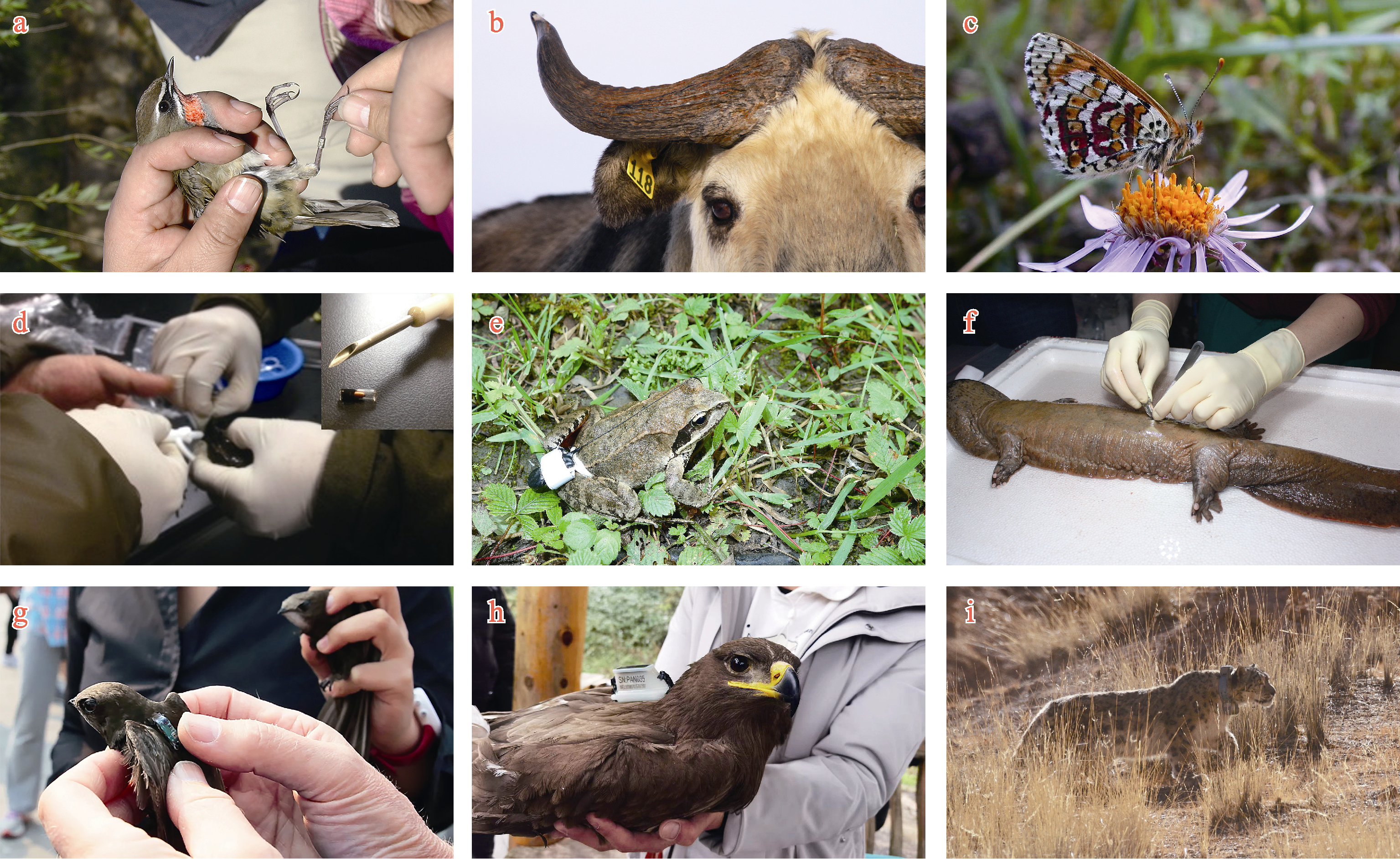 | Fig. 1 Examples of traditional (a-c) and sensor-based (d-i) tracking technologies used in wildlife studies in China. a, Metal leg band used for Siberian rubythroat (Calliope calliope); b, Ear tag used for Chinese takin (Budorcas taxicolor); c, Marked number on the wing of Glanville fritillary (Melitaea cinxia); d, RFID tag implanted under skin of Asiatic toad (Bufo gargarizans); e, Backpacked VHF transmitter used for Chinese brown frog (Rana chensinensis); f, VHF transmitter implanted in the abdominal cavity of Chinese giant salamander (Andrias davidianus); g, Backpacked light-level geolocator used for common swift (Apus apus); h, Satellite-tracking device used for steppe eagle (Aquila nipalensis); i, Satellite-tracking colloar used for snow leopard (Panthera uncia). Photos were provided by Sheng Li ( |