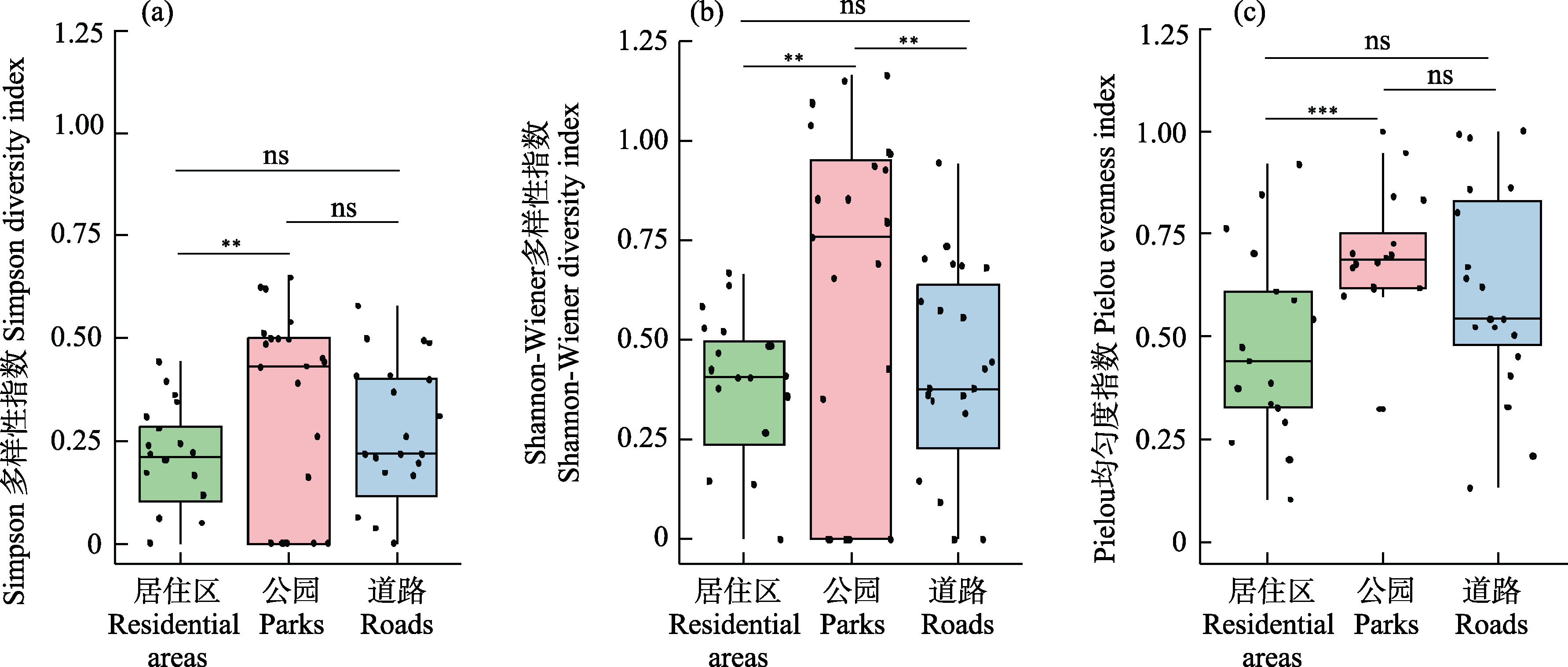 | 图4 居住区绿地、公园绿地和道路绿地中果蝇的α多样性。** P < 0.01; *** P < 0.001; ns: P > 0.05。 |