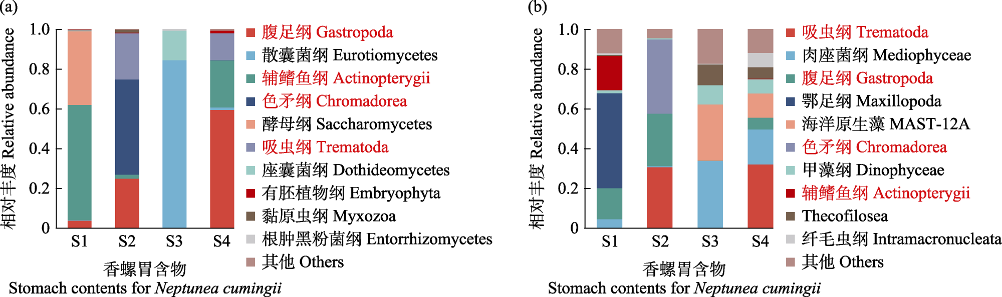 | Fig. 2 Relative abundance of stomach contents for Neptunea cumingii in the class level (S1‒4 represents different samples). (a) 18S rDNA V4 hypervariable region; (b) 18S rDNA V9 hypervariable region. The red font in the legend indicates the taxonomic categories identified by both the 18S rDNA V4 and V9 regions. |
