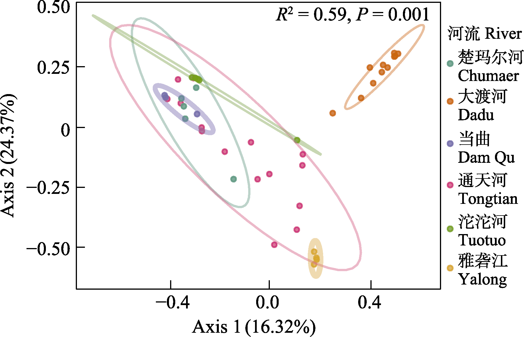 | 图3 长江源区各水系鱼类群落主坐标分析图。图中不同颜色的点代表不同水系的鱼类群落,通过点的分布观察不同水系间群落结构的差异。 |