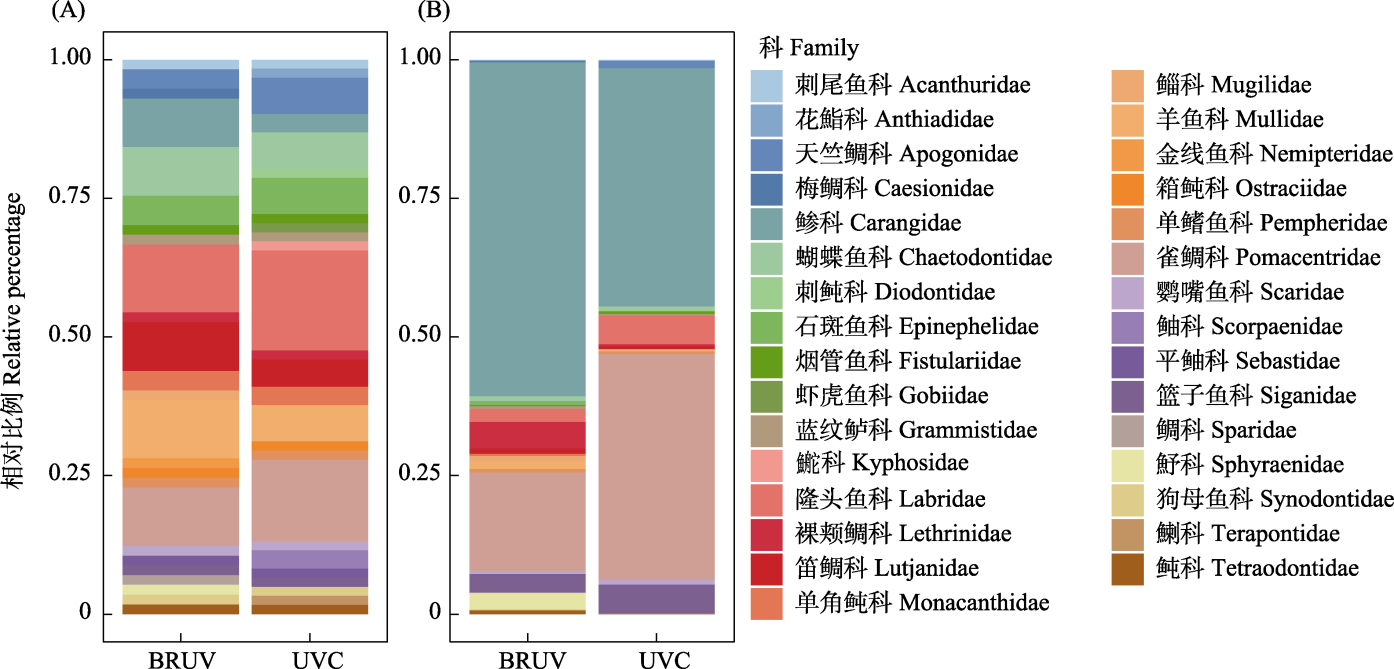 | 图3 诱饵式水下相机监测(BRUV)与水下目视调查(UVC)的物种组成差异。(A) BRUV和UVC监测到的科水平物种丰富度。(B) BRUV和UVC监测到的科水平相对丰度。 |