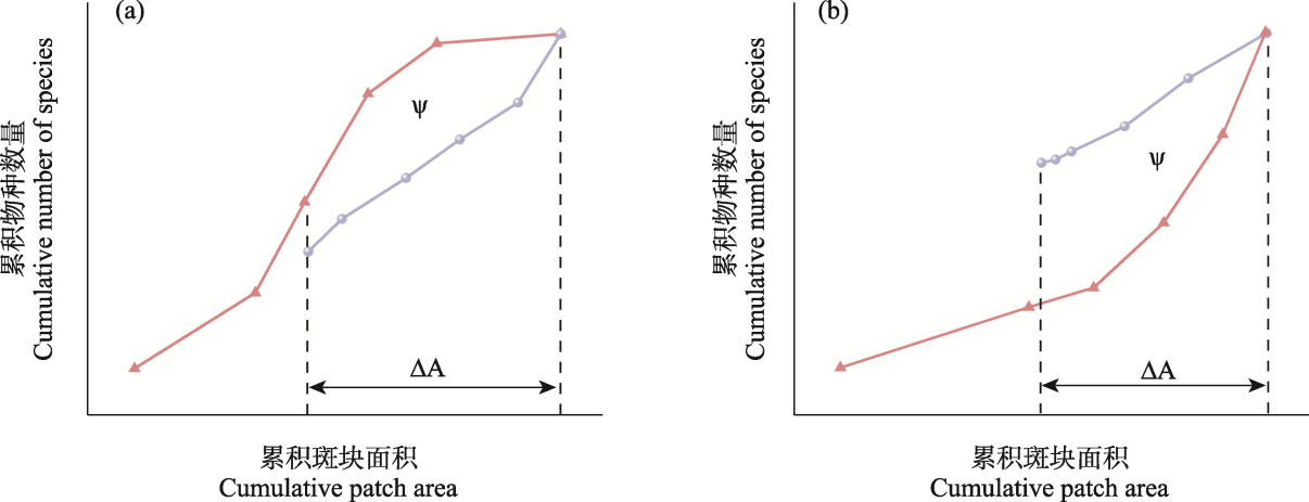 图3 用于表征从小到大累积曲线(红色)和从大到小累积曲线(灰色)之间偏差的ξ统计量以及指标ΔA示意图。Ψ代表从最大斑块面积推导出的两条曲线下面积的差值; ΔA表示估算两个面积的区域范围。图(a)表示ξ统计量为正的情况, 图(b)代表ξ统计量为负的情况。 |