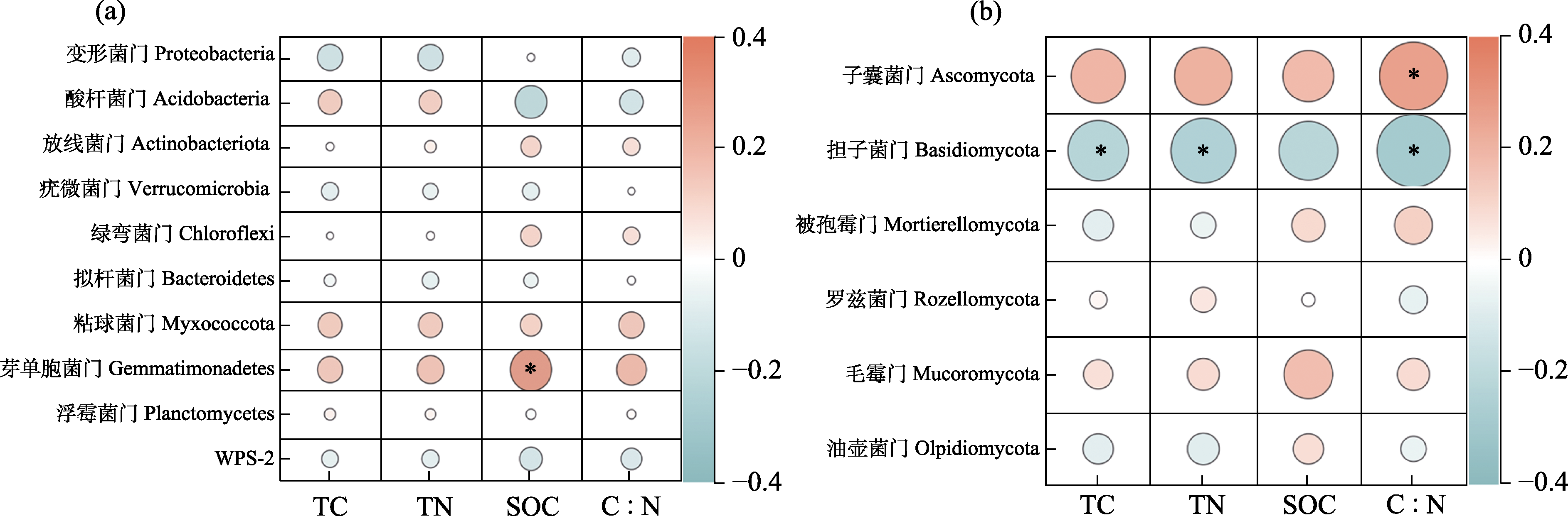 图5 根际土壤细菌(a)、真菌(b)优势菌门与土壤碳氮因子的Pearson相关性分析。颜色条刻度表示Pearson相关系数(r)值。橙色代表正相关, 绿色代表负相关; 颜色深浅表示相关性强弱; * P < 0.05。TC: 全碳; TN: 全氮; SOC: 土壤有机碳。 |