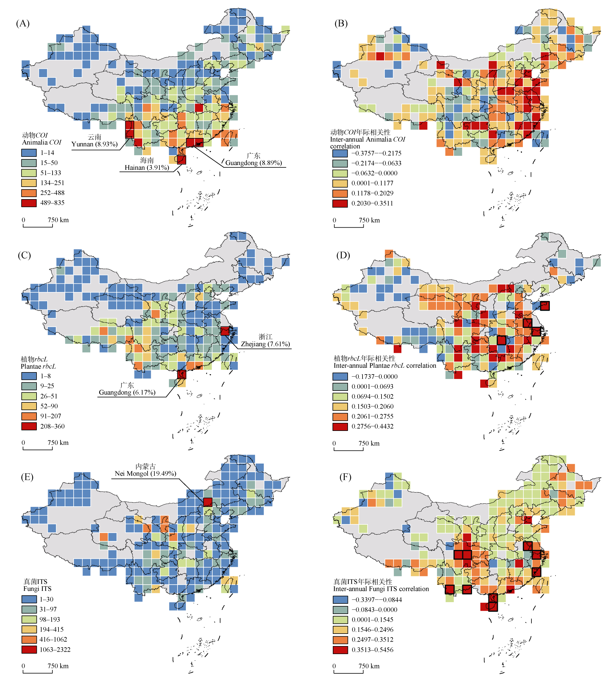 | 图2 动物界(A、B)、植物界(C、D)和真菌界(E、F)代表序列中国时空分布格局。左列(A、C、E)展示中国区域动物界(COI)、植物界(rbcL)和真菌界(ITS)序列的空间分布格局, 基于2° × 2°网格系统, 颜色梯度表示采用自然断点法划分的6个序列密度等级; 右列(B、D、F)展示中国区域动物界(COI)、植物界(rbcL)和真菌界(ITS)序列的年际变化趋势, 通过一般线性模型计算各网格内序列数量与年份的相关系数(正值表示增长趋势, 负值表示下降趋势), 黑色边框表示相关系数达到显著(P < 0.05)的网格。 |